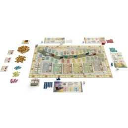 En un mundo inspirado en La Leyenda de los 5 Anillos, de 2 a 5 jugadores (14+ años) compiten por establecer puestos y edificaciones a lo largo del río, comerciar con seda, arroz y porcelana, y gestionar contratos con clientes influyentes. Cada acción requiere lanzar dados, pero puedes invocar el favor divino para ajustar resultados.