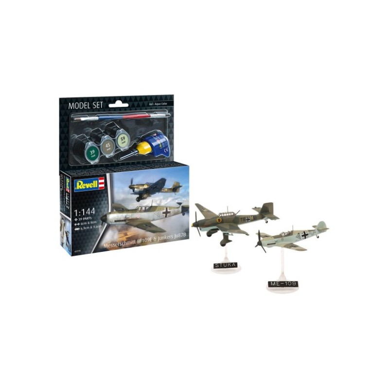 Este Model Set a escala 1:144 incluye dos modelos emblemáticos de la Luftwaffe: el caza Messerschmitt Bf 109E y el bombardero en picado Ju 87B Stuka, ambos con soporte expositivo y detalles auténticos.