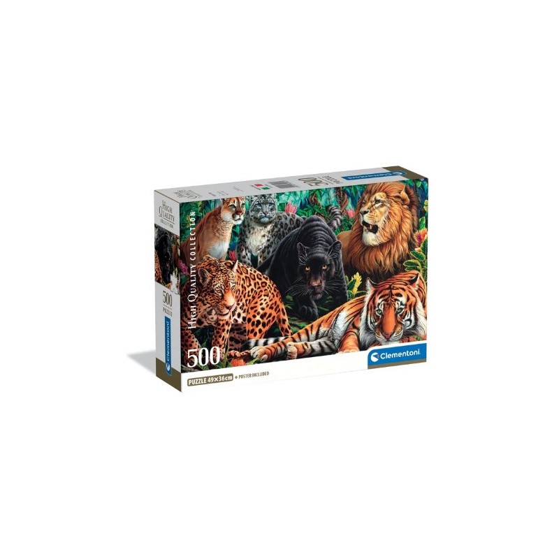 Dentro de la High Quality Collection de Clementoni y en su versión Compact Box, este puzzle ofrece una poderosa composición protagonizada por tigres, leones, leopardos y otros grandes felinos. Cada animal aparece capturado en detalle con expresiones intensas y pelajes definidos, destacando sobre un fondo natural. Perfecto para quienes buscan una experiencia visual vibrante y con carácter.