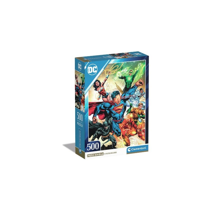Un dinámico puzzle de 500 piezas que reúne a los superhéroes más icónicos de DC Comics, ideal para fans del universo de Batman, Superman y Wonder Woman.